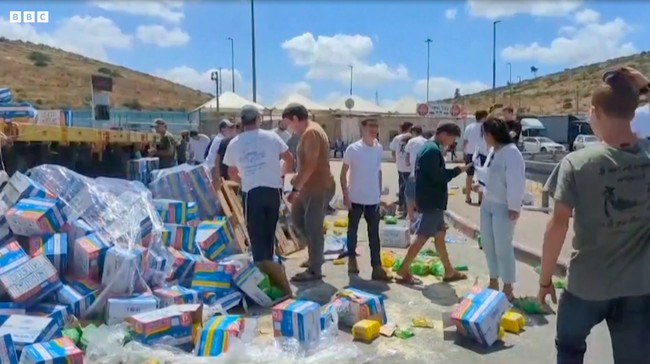 BBC melaporkan ada tujuh truk bantuan yang dirusak oleh demonstran Israel ini. Bahan makanan untuk Gaza telah mereka rusak dan berkarung-karung gandum mereka rusak. Mereka melemparkan bantuan ke jalanan setempat.
