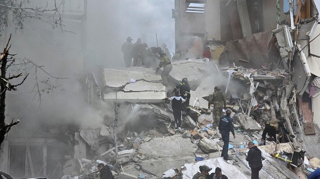 Layanan darurat Rusia mempublikasi rekaman video yang menunjukkan sebuah derek dan tim penyelamat sedang bekerja di antara puing-puing gedung lima lantai yang hancur pada malam hari.