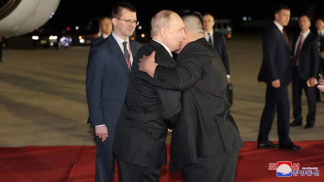 Kim Jong Un menyapa dan menjabat tangan Putin yang mendarat di Pyongyang pada Rabu (19/6) dini hari waktu setempat. Tidak hanya itu, Kim Jong Un dan Putin juga disebut saling berpelukan saat bertemu dan berbicara di dekat pesawat yang membawa Presiden Rusia itu.