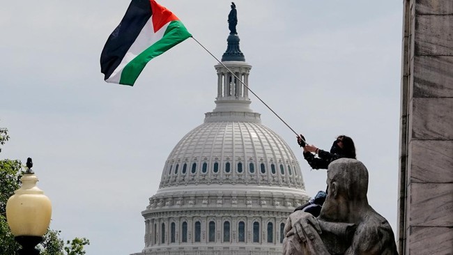 Seperti dilansir Reuters dan AFP, Kamis (25/7/2024), para demonstran yang menuntut AS menghentikan bantuan militer untuk Israel, mengibarkan bendera Palestina dan membakar bendera AS dalam aksi di luar Union Station, yang terletak dekat Gedung Capitol di Washington DC, pada Rabu (24/7) waktu setempat.