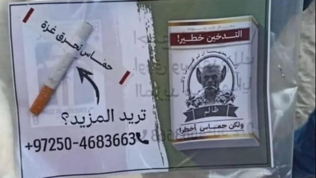 "Merokok itu berbahaya, tapi Hamas jauh lebih berbahaya. Ingin lebih banyak? Hubungi kami," demikian bunyi salah satu selebaran yang dijatuhkan dari udara oleh militer Israel di Jalur Gaza.