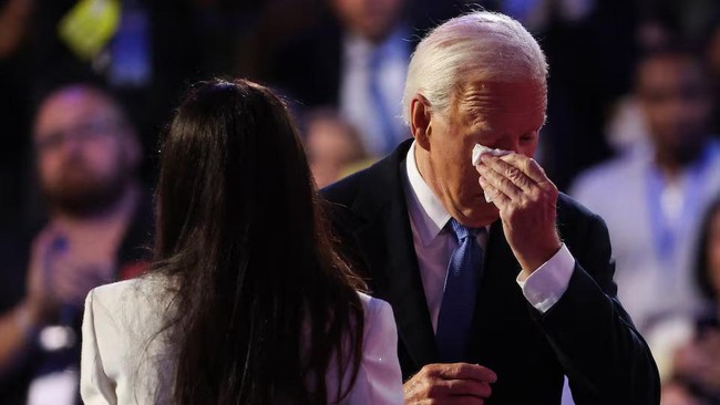 Seperti dilansir France24 dan The Telegraph, Selasa (20/8/2024), Biden naik ke panggung setelah diperkenalkan oleh putrinya, Ashley, kepada para hadirin. Ayah dan anak itu lantas berpelukan, sebelum Biden tampak mengambil sapu tangan dari saku celananya dan mengusap air matanya.