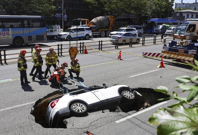 Sinkhole itu disebut memiliki kedalaman sekitar delapan kaki atau setara 2,5 meter. Media lokal Korea Herald melaporkan mobil tersebut 'terguling ke samping dan terjatuh ke dalam sinkhole'.