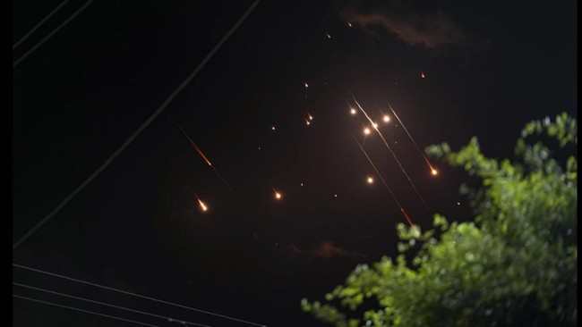 Warga Palestina di Jalur Gaza, yang terjebak dalam perang selama hampir satu tahun dengan Israel, melakukan perayaan saat menyaksikan puluhan rudal Iran mengudara menuju ke Israel. Beberapa dari rudal itu terjatuh di wilayah kantong Palestina tersebut setelah dicegat pertahanan udara Israel, Iron Dome.