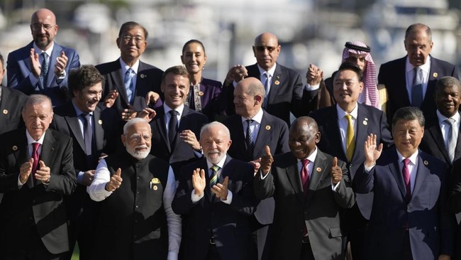 Para pemimpin dunia, termasuk Presiden China Xi Jinping, PM India Narendra Modi, dan Presiden Prancis Emmanuel Macron, tampak mengobrol saat berkumpul untuk berpose dengan latar belakang Gunung Sugarloaf yang menjadi ikon Rio de Janeiro. Mereka tersenyum dan mengangkat tangan saat diambil fotonya.