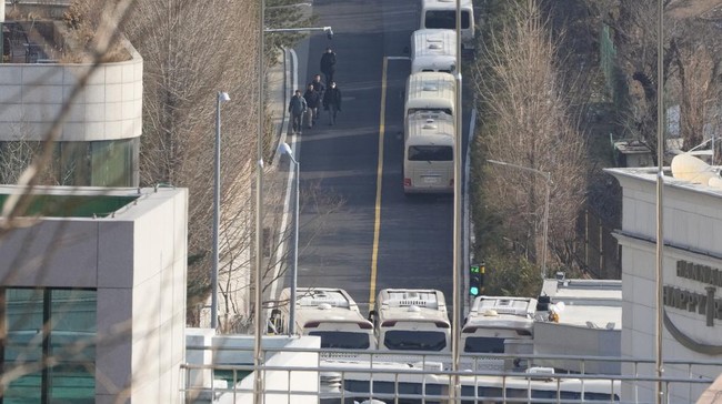 Jalan utama di depan kediaman Yoon ditutup total dengan barikade bus polisi pada Rabu pagi, sementara ribuan pendukungnya yang keras berkumpul di luar.