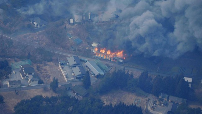 Rekaman dini hari dari Ofunato yang disiarkan televisi nasional NHK menunjukkan kobaran api di dekat gedung-gedung dan asap putih mengepul ke udara.
