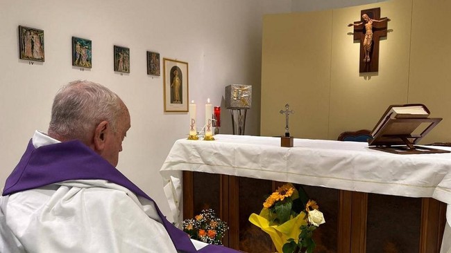 Vatikan merilis foto pertama Paus Fransiskus sejak Paus berusia 88 tahun itu dirawat di rumah sakit lebih dari sebulan yang lalu karena pneumonia di kedua paru-parunya. Foto itu menunjukkan Paus Fransiskus beribadah misa kudus.