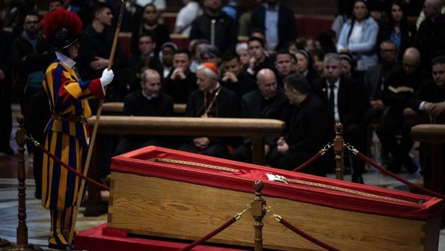 Peti jenazah Paus Fransiskus yang terbuat dari kayu dan seng, yang disegel pada Jumat (25/4) malam, akan diletakkan di depan Basilika Santo Petrus, di depan altar sementara yang dibangun dengan posisi agak tinggi.