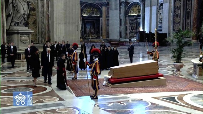 Trump, seperti dilansir CNN dan AFP, Sabtu (26/4/2025), didampingi oleh istrinya atau Ibu Negara AS, Melania, saat memberikan penghormatan terakhir kepada Paus Fransiskus di dalam Basilika Santo Petrus.