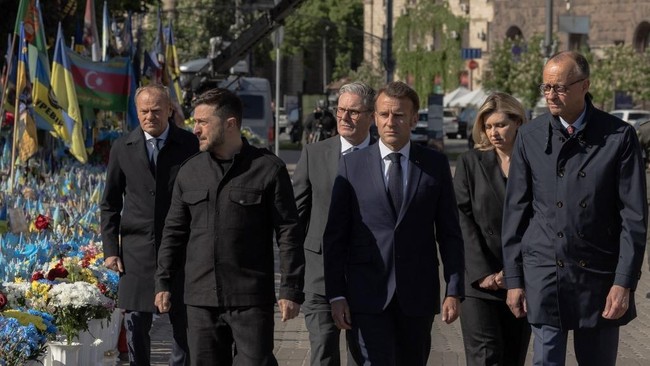 Kunjungan itu dilakukan setelah ketiga negara tersebut berjanji untuk meningkatkan tekanan terhadap Rusia, hingga negara itu menyetujui gencatan senjata sehari setelah parade militer mewah digelar di Moskow untuk memperingati 80 tahun berakhirnya Perang Dunia II.