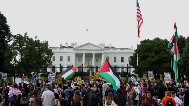 Warga Amerika Serikat (AS) berunjuk rasa di depan Gedung Putih, Amerika Serikat. Mereka menuntut Presiden AS Donald Trump tidak terlibat jauh dalam perang antara Israel dan Iran.