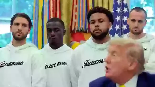 Ada yang menarik ketika Presiden Amerika Serikat Donald Trump berbicara tentang perang Iran dan Israel di Gedung Putih. Di belakang Trump, tampak para pemain sepakbola Juventus yang berdiri canggung mendengarkan perkataan Trump.
