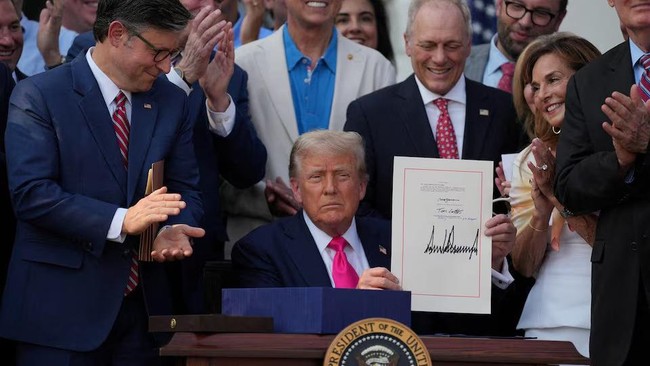 "Itu bagus. One Big Beautiful Bill," ucap Trump saat menandatangani dokumen UU itu dengan diapit oleh sejumlah anggota parlemen AS dari Partai Republik.