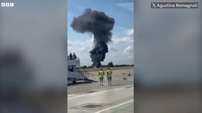 Rekaman video menunjukkan sebuah pesawat sepanjang 12 meter itu terbakar dengan kepulan asap hitam.