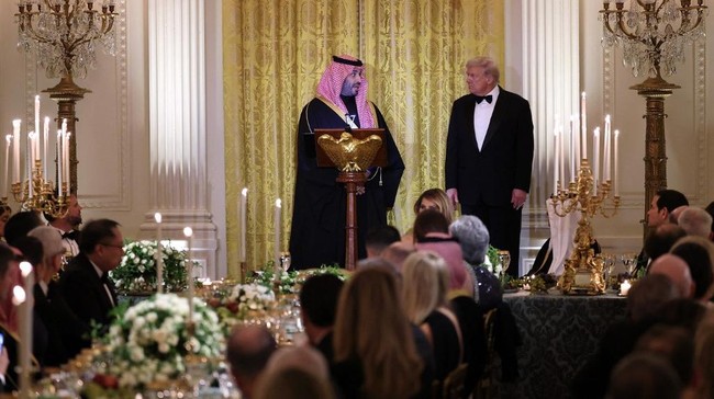 Jamuan makan malam kenegaraan untuk menghormati MBS itu digelar di East Room Gedung Putih pada Selasa (18/11) malam. Momen itu memberikan kesempatan kepada sang Pangeran Saudi untuk menikmati jamuan makan malam kenegaraan, meskipun dia bukan kepala negara dan hanya penguasa de-facto Kerajaan Saudi.