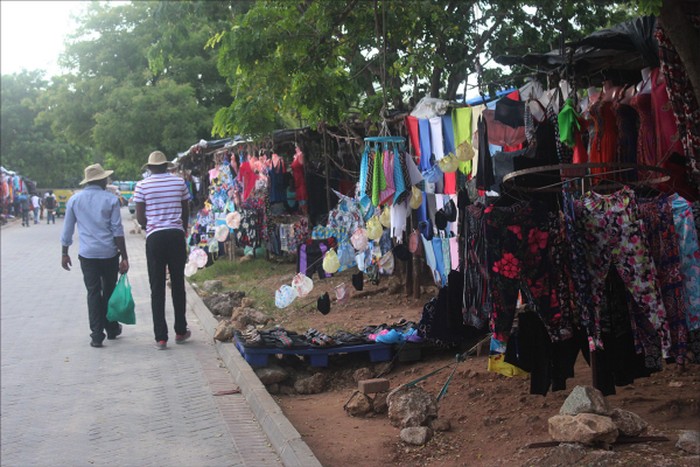Pertama kali saya merasakan "kesulitan" karena tidak boleh menggunakan kantong plastik adalah ketika membeli minuman kemasan di bandara. Penjual hanya memberi minuman tersebut tanpa dibungkus apa pun. Agak aneh sih, apalagi jika terbiasa menerima barang di kantong plastik selama di Indonesia. Bagaimana orang sini membungkus belanjaannya jika jumlahnya cukup banyak? Batin saya saat itu. Di Kota Mombasa, saat saya berbelanja, pertanyaan tersebut terjawab. Mereka menggunakan kantong berbahan kain yang sangat tipis. "Apakah di sini tidak ada plastik?" tanya saya pada penjual kain.