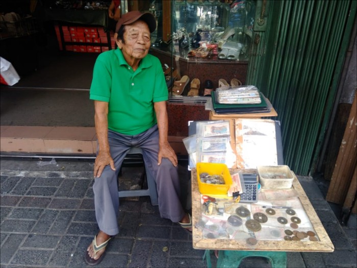 Di tengah keramaian suasana itu, pengunjung bisa menangkap keberadaan sesosok lelaki sepuh yang duduk di sebuah kursi plastik, di depan Toko Sepatu New. Di sampingnya diletakkan sebuah papan kayu persegi di atas sebuah kursi plastik. Jika pengunjung mendekat, lekaslah terlihat beragam koin dan uang kertas yang dijajakan di papan tersebut. Pak tua itu ternyata menjual uang-uang kuno.