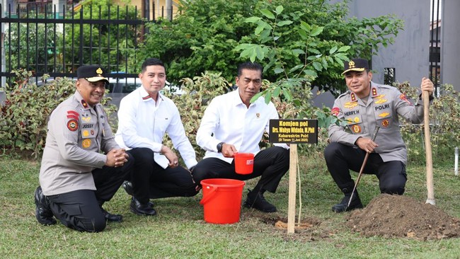 Penanaman pohon dilaksanakan di halaman Polda Riau, pada Rabu (11/6/2025). Komjen Wahyu Widada didampingi Kapolda Riau Irjen Herry Heryawan dan sejumlah pejabat utama (PJU) Polda Riau.