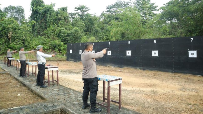 Latihan menembak berlangsung di Lapangan Tembak Endra Dharmalaksana, Jalan Lintas Timur, Polsek Rengat Barat, Rabu (18/6). Total ada 69 personel yang dilatih menembak.