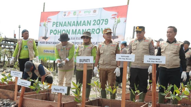 Polres Kepulauan Meranti melakukan penanaman pohon menjelang HUT Bhayangkara ke-79, sekaligus memperingati Hari Lingkungan Hidup Sedunia. Sebanyak 2.079 bibit pohon mangrove ditanam di kawasan pesisir Desa Mekong, Kecamatan Tebing Tinggi, Kepulauan Meranti, Riau.