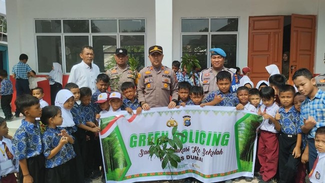 "Kami hadir mewakili Bapak Kapolres Dumai dalam mengajak adik-adik kita di sekolah untuk mencintai lingkungan dengan cara yang sederhana namun bermakna, yakni menanam pohon," ujar Iptu Anra yang mewakili Kapolres Dumai AKBP Angga F Herlambang.
