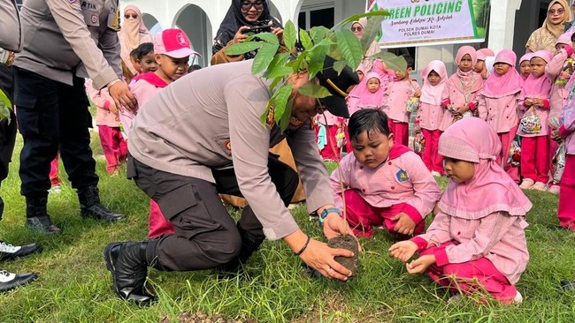 Anak-anak TK tersebut berkumpul di halaman sekolah pada Senin (28/7/2025) pagi tadi. Dengan berseragam baju olahraga, mereka sudah siap menanam pohon bersama Kapolsek Dumai Kota Iptu Muhammad Iqbal.