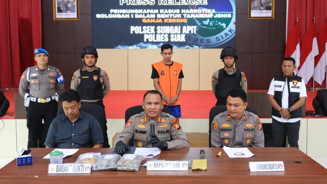 Polres Siak menggelar operasi narkoba dan menangkap seorang pengedar di Desa Suak Merambai, Kecamatan Bunga Raya. Dalam operasi ini, polisi menyita ganja kering siap edar seberat 2,2 kilogram.