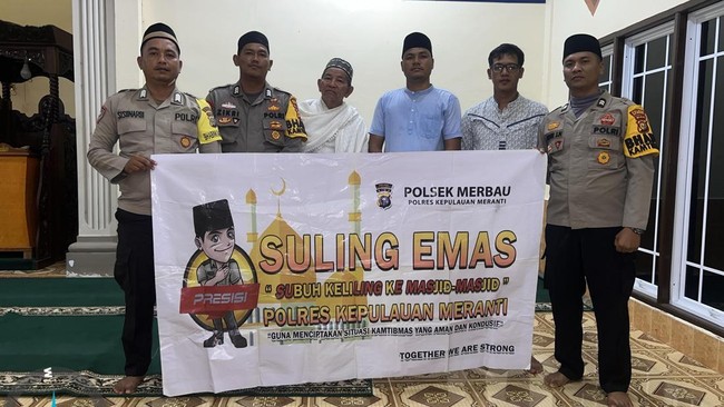 Polres Kepulauan Meranti menunjukkan komitmennya menjaga silaturahmi dengan masyarakat melalui program Subuh Keliling ke Masjid-masjid (Suling Emas). Tak hanya mempererat silaturahmi, kegiatan ini juga menjadi wadah polisi dalam memberikan edukasi kepada warga mulai dari menanam pohon hingga mencegah karhutla.