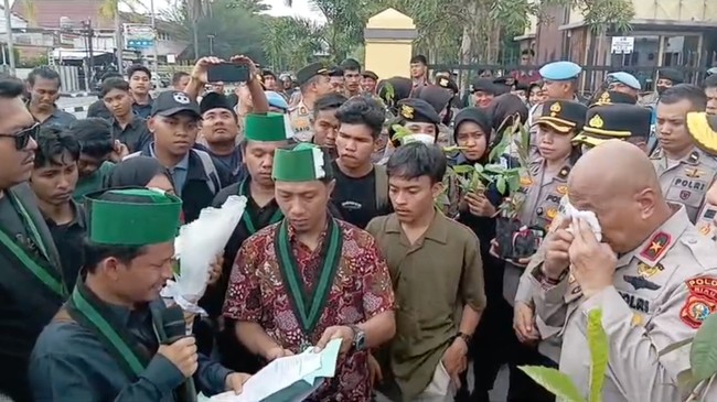 Momen ini terjadi saat Ketua Umum Badko HMI Riau-Kepri, Wiriyanto Aswir, menyampaikan aspirasinya di depan Mapolda Riau, Selasa (2/8/2025). Massa HMI diterima oleh Wakapolda Riau Brigjen Jossy Kusumo.