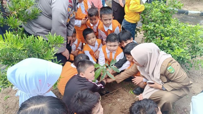 Polantas Polres Indragiri Hilir (Inhil) turun ke taman kanak-kanak (TK) untuk memberikan penyuluhan tentang peduli lingkungan dan hutan kepada generasi Alpa. Polisi mengajak anak-anak TK untuk menanam pohon.
