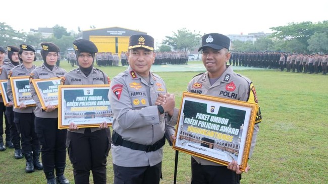 Penghargaan diserahkan secara langsung oleh Kapolda Riau Irjen Pol Herry Heryawan dalam Apel Apresiasi di Mapolda Riau, Rabu (8/10) pagi tadi. Kapolda menyampaikan apresiasi kepada personel yang telah menunjukkan dedikasinya dalam menyukseskan program Green Policing serta peningkatan keamanan melalui Satkamling.