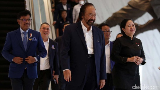 Kedatangan Puan disambut pelukan hangat Surya Paloh. Puan membalas pelukan Surya Paloh yang sudah dianggapnya seperti keluarga.