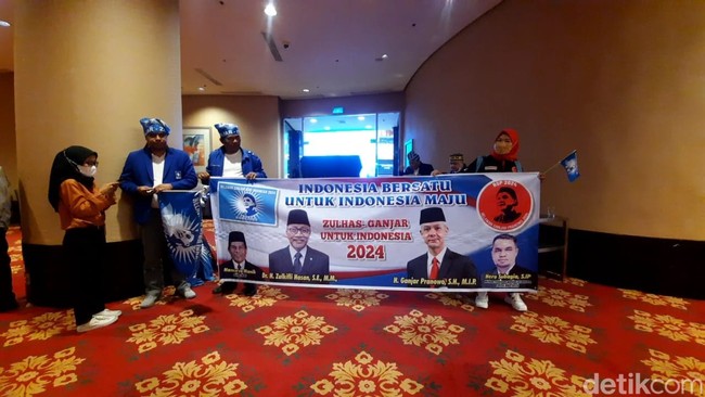 Pantauan detikcom di The Ritz Carlton, SCBD, Jakarta, Sabtu (27/8/2022) terlihat mereka membawa atribut berupa bendera PAN dan spanduk dengan gambar Ketua Umum PAN Zulkifli Hasan dan Gubernur Jawa Tengah Ganjar Pranowo.