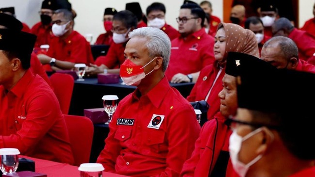 Gubernur Jawa Tengah (Jateng) Ganjar Pranowo menghadiri rapat koordinasi kepala daerah dari PDIP. Ganjar hadir mengenakan baju merah dengan lambang banteng di dada.