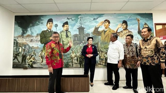 Sebelum acara diskusi, Hasto memamerkan lukisan pertempuran 10 November yang ada di Gedung DPP PDIP, Menteng, Jakarta Pusat. Dia menyebut dulunya pejuang menyobek bagian biru dari bendera belanda.