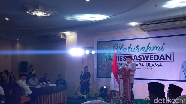 Bakal calon presiden dari Partai NasDem, Anies Baswedan, bersilaturahmi dengan para ulama di Hotel Madani, Medan, Sumatera Utara. Dalam sambutannya, Anies mengenang proses pencalonannya sebagai Gubernur DKI Jakarta.