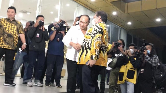 Pantauan detikcom, Senin (7/11/2022) pukul 19.35 WIB, Airlangga tiba di markasnya. Gabungan relawan Jokowi diwakili oleh Ketua Umum Relawan Pro Jokowi (Projo) Budi Arie Setiadi yang sudah tiba lebih dulu tampak menyambut kehadiran Airlangga.