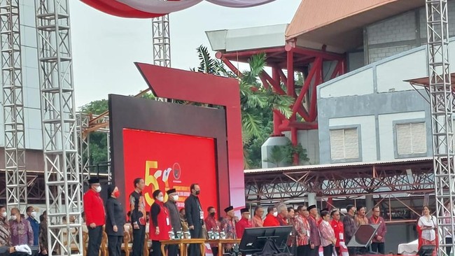Acara HUT ke-50 PDIP saat ini masih menyajikan aksi marching band dan tarian. Megawati hingga Jokowi belum menyampaikan pidato politiknya.