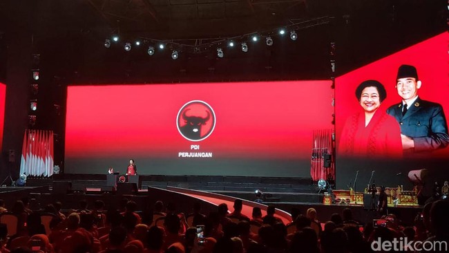 Ketum PDIP Megawati Soekarnoputri memberikan pidato politiknya saat acara puncak HUT ke-50 PDIP. Megawati menyapa kader PDIP yang hadir di lokasi HUT ke-50 PDIP.