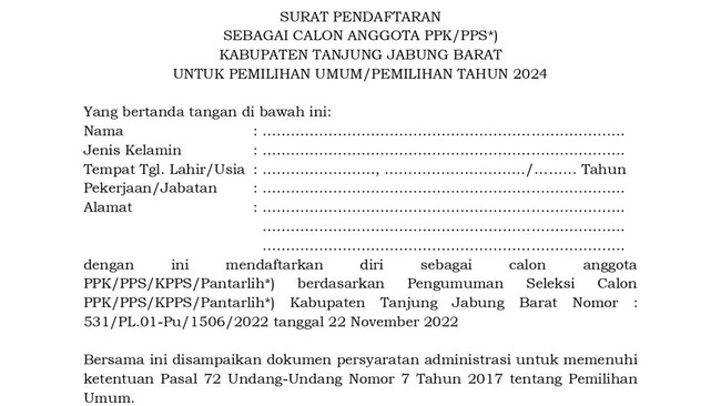 Sebagai contoh, berikut ini link download form Surat Pendaftaran Pantarlih Pemilu 2024 yang dilansir situs KPU untuk Pantarlih Kabupaten Tanjung Jabung Barat: