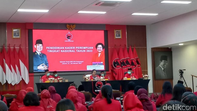 Ketua Umum PDI Perjuangan Megawati Soekarnoputri memberikan pengarahan dalam kegiatan Pendidikan Kader Perempuan Tingkat Nasional 2023. Dalam pengarahannya, Megawati berbicara mengenai stunting hingga hasil survei.