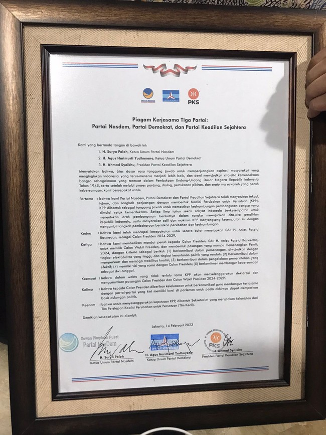 Partai NasDem, Partai Demokrat, PKS, yang mencapreskan Anies Baswedan telah meneken piagam deklarasi Koalisi Perubahan untuk Persatuan atau KPP. Piagam itu memuat 6 poin kesepakatan. Apa saja?