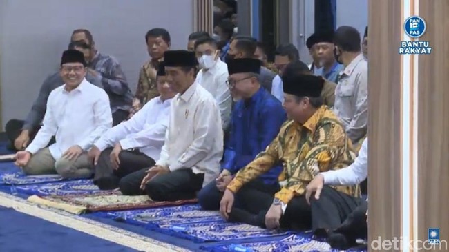 Terlihat di lokasi ketua umum PKB Muhaimin Iskandar atau Cak Imin, Ketum Gerindra Prabowo Subianto, Ketum PAN Zulhas, Ketum Golkar Airlangga Hartato hingga Plt Ketum PPP Mardiono mendampingi Jokowi duduk lesehan.
