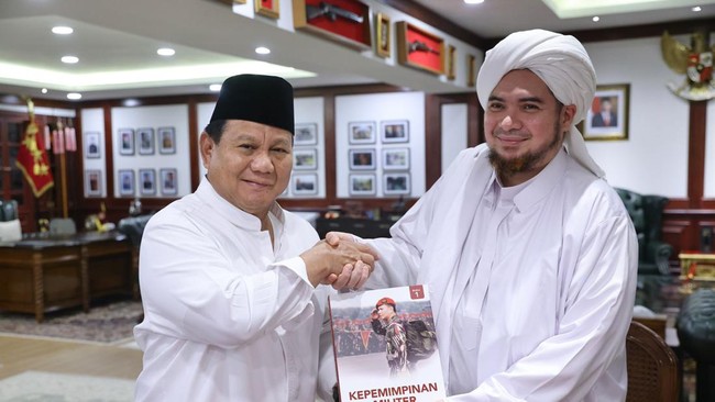 Menteri Pertahanan Prabowo Subianto menerima kunjungan silaturahmi dari pendakwah Habib Jindan di kantor Kemhan. Prabowo mengungkapkan kekaguman terhadap Habib Jindan.