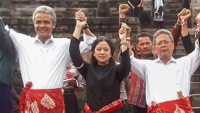 Puan terlihat mengenakan pakaian serba hitam dengan tambahan selendang berwarna merah, sedangkan Ganjar dan Heru berseragam putih berbalut ornamen sarung merah.