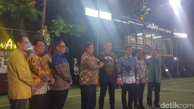 Pantauan detikcom di lokasi, Sabtu (29/4/2023), Airlangga sekitar pukul 18.49 WIB. Airlangga mengenakan batik berwarna kuning. Terlihat hadir mendampingi Airlangga, Sekjen Golkar Lodewijk Paulus hingga beberapa elite Golkar.