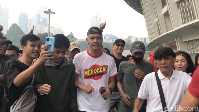 Gubernur Jawa Tengah sekaligus bakal calon presiden (bacapres) PDIP, Ganjar Pranowo jalan sehat bersama para relawan dan masyarakat di Gelora Bung Karno (GBK) pagi ini. Teriakan 'presiden' muncul selama kegiatan berlangsung.