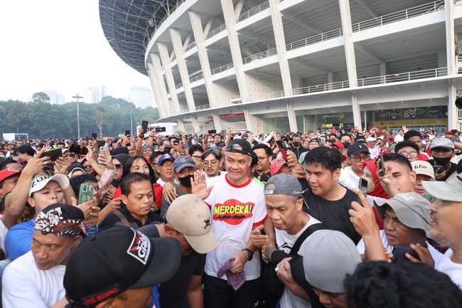 Gubernur Jawa Tengah Ganjar Pranowo disambut antusiasme para pendukung saat berlari di kawasan Stadion Gelora Bung Karno (GBK) Jakarta Pusat pagi ini. Ganjar yang sedang berlari dari simpang FX Sudirman ini langsung dikerubungi kawula muda hingga kelompok lanjut usia yang berada di lokasi tersebut.