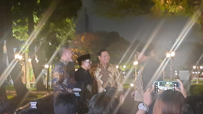 Pantauan detikcom, Prabowo, Zulhas, dan Mardiono keluar dari di Istana Negara, Jakarta, Selasa (2/5/2023), sekitar pukul 21.51 WIB. Terlihat ketiganya berjalan bersama menuju pintu keluar.